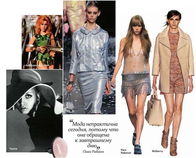 Другой футурист от моды бо-х, Пако Рабанн, также внес большой вклад в развитие этого направления, показав коллекцию из технологичных материалов, кульминацией которой стало знаменитое платье из металлических пластин. Ему же принадлежит идея использования пластика в аксессуарах - одного из актуальнейших трендов нынешней весны, поддержанного в коллекциях сумками Burberry, браслетами Chloé, босоножками Alexander Wang. В космическую эру в моде внес лепту и гротескный фильм Роже Вадима «Барбарелла», а именно облик Джейн Фонды в нарядах из металлических пластин и пластика. А финальная сцена фильма в зеленом боди из пластин, придуманном Жаком Фонтереем по мотивам идей Рабанна, и вовсе вошла в историю костюма. У Michael Kors на весеннем показе промелькнули юбки-карандаш из плексигласа, которые выглядят логичным продолжением этой идеи. Но если псевдо латы для межгалактических войн сложно сделать повседневным нарядом, то синтетические ткани вроде полиамида, нейлона и даже алюминиевой фольги получили настоящую путевку в жизнь. В новом сезоне дизайнеры часто заставляют нас гадать на предмет состава тканей. В явных фаворитах - прозрачный пластик, ткани с голографическим эффектом и виниловая кожа. Так, у Dior на платья-бюстье в крупную полоску нашиты прозрачные чехлы из флюоресцентной ткани, а Дерек Лэм сшил юбки из материала, больше похожего на пластиковую гирлянду. У Nina Ricci костюм с характерными признаками кроя шестидесятых сшит из текстурированного крепа с переливающейся серебристой пропиткой, а Джонатан Сандерс представил юбки-карандаш и бомберы из металлизированной кожи, напоминающей обшивку космического корабля. Винил - также знаковый материал шестидесятых, достаточно вспомнить пальто Катрин Денев в «Дневной красавице». Мiu Miu поддержали тенденцию кейпом из ткани ciré с вощеным покрытием, а в Chanel появилось красное пальто прямого силуэта из кожи с пропиткой.